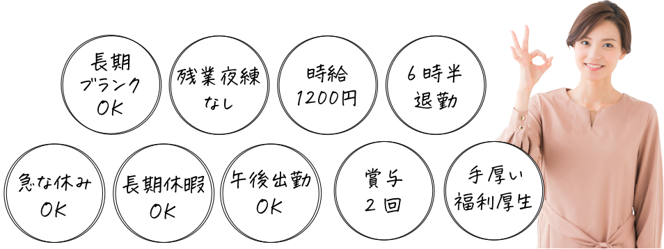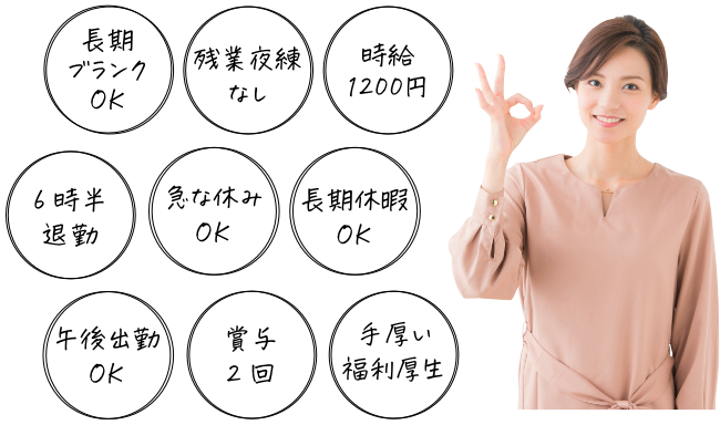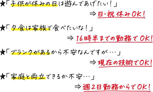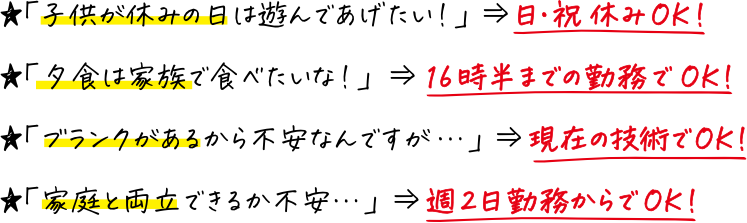 週 2 日、1 日 3 時間から自分のペースで働く事が出来ます。土日祝休みもご相談下さい。「子供の学校の行事でお休みしたい」「子供が急に熱を出した」など、家庭の事情でお休みが必要な場合など、休みが取れるように協力・サポートします︕ライフスタイルに合わせた働き方が可能です︕